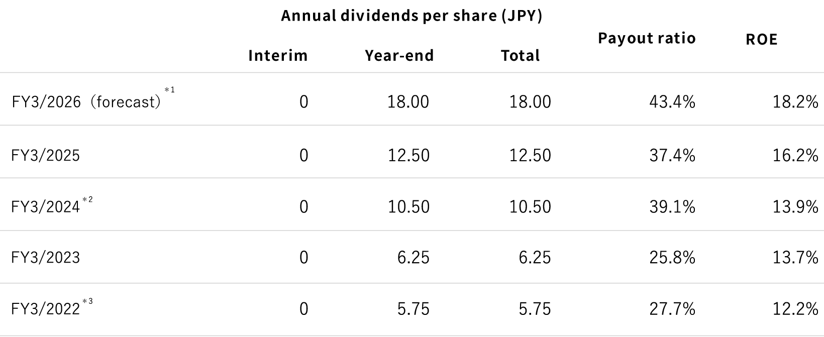 Simplex Holdings (hereafter referred to as the Company) believes that prioritizing investments for growth that helps strengthen its business foundation will contribute to achieving profit growth and improving its corporate value in a sustainable manner while maintaining its financial soundness based on its strong cashflow-generating capability. In addition, the Company is committed to pursuing a management approach mindful of capital efficiency and has therefore set an ROE target as one of its KPIs. The Company is also aware that providing shareholder returns, which helps increase capital efficiency, is a key measure in capital allocation. Based on this belief, the Company seeks to enhance shareholder returns by paying dividends as a fundamental measure, comprehensively considering trends in business performance, ROE level, opportunities of investments for growth, and other factors.