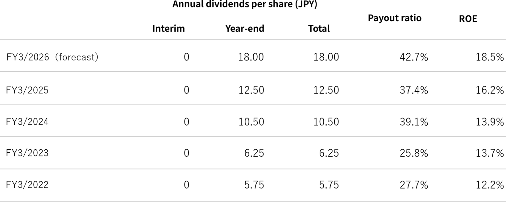In calculating the dividend payout ratio and ROE, the impact of the share repurchase resolved at the Board of Directors’ meeting held on January 29, 2026 has not been taken into account. After reflecting the impact of the share repurchase, the dividend payout ratio for the fiscal year ending March 31, 2026 is expected to be approximately 42.3 percent, and ROE is expected to be approximately 19.4 percent.