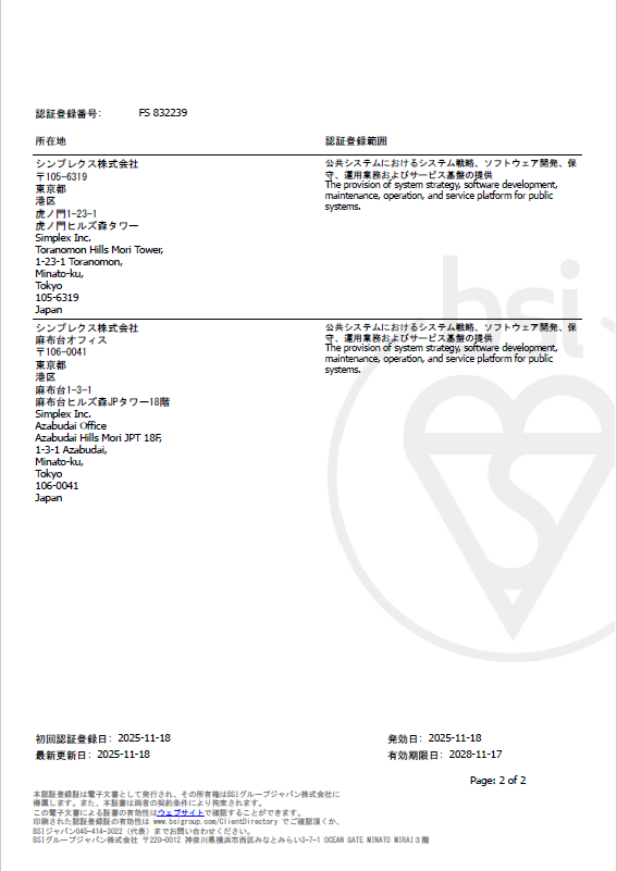 シンプレクス株式会社では、下記の登録範囲で品質マネジメントシステム(ISO 9001)の認証を取得しています。